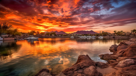 Boats float in harbor as sunset casts bright colors across the sky. The water reflects vibrant hues and leaves space at the top for text.