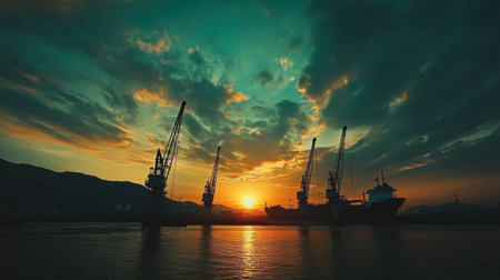 Captivating silhouette of cranes and ships in a bustling port at sunset. Golden skies reflect on calm waters, showcasing industrial beauty and tranquility.
