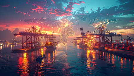 A stunning night scene of a busy shipping port, showcasing cranes and container ships, set against a dramatic sky. The illuminated waterfront reflects vibrant colors in the water, highlighting industrial activity and the importance of maritime trade.