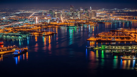 An expansive aerial view of the San Francisco Bay waterfront at night, alive with a vibrant display of city lights. The urban landscape is illuminated by countless glowing lights from buildings, streets, and the iconic Bay Bridge. The dark water reflects the colorful illumination, creating a spectacle. The industrial port area is active with illuminated cranes and ships, highlighting the bustling commerce and transportation hub. The scene is a testament to the energy and vibrancy of the city...