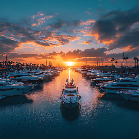A breathtaking sunset over a vibrant harbor filled with luxury yachts, showcasing colorful skies and tranquil water reflections, perfect for travel inspiration.