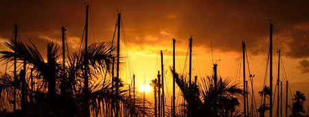 Panoramic from the marina at sunrise with palm trees and ship masts, Las Palmas of Gran Canaria, Spain