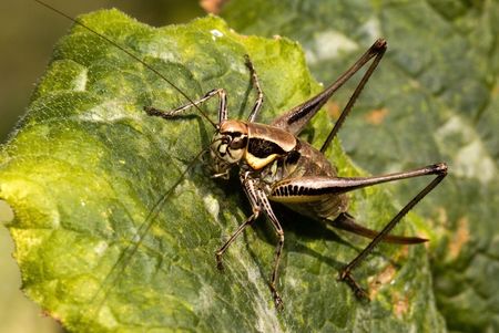 Natural closeup on a Southern wartbiter locust or White-faced Bush-Cricket , Decticus albifrons sitting on the ground