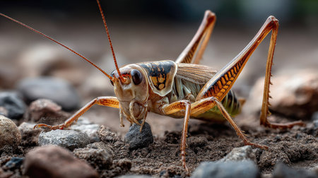 This stunning macro image showcases a colorful grasshopper lounging on earthy soil, surrounded by tiny pebbles. The intricate details and vivid colors highlight the beauty of nature's small creatures.