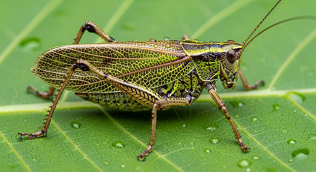 A detailed macro shot featuring a green grasshopper resting on a textured leaf, highlighting the intricate patterns and vibrant colors of both the insect and foliage.