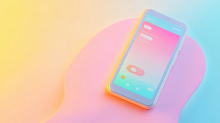 A sleek smartphone rests on a vibrant, colorful background featuring playful curved shapes. The image showcases a minimalistic design with bright pink, yellow, and blue tones, creating a modern and artistic look. This composition is perfect for technology, lifestyle, and artistic themes.
