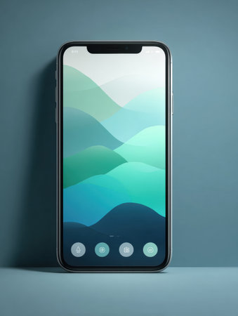 A smartphone stands upright against a smooth surface, showcasing an artistic green and blue wave wallpaper in a bright indoor environment.