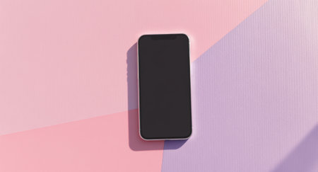 Modern smartphone with a blank black screen placed on a vibrant pink and purple geometric background. Minimalistic design and technology concept with soft shadows.