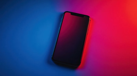 A sleek smartphone sits against a vibrant blue and red gradient background, showcasing a blank screen. The minimalistic design highlights modern technology and creativity.