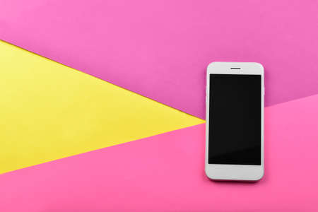 Top view of mockup smartphone with blank screen on colorful paper background.technology and communication concept.Flat lay