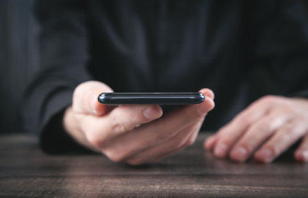 Side view of man's hand holding smart phone isolated on dark background with copy space