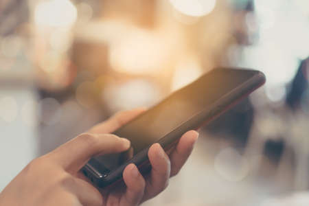 Woman hand using smartphone in cafe shop blur beautiful background. Business, financial, trade stock maket and social network concept.