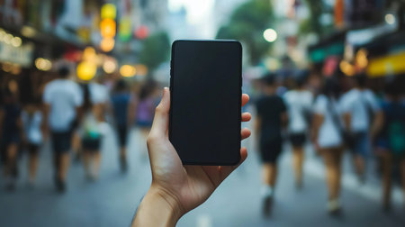 A hand showcasing a smartphone in a vibrant urban environment, with a blurred crowd in the background. The image captures technology and daily life in the city.