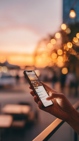 Person using smartphone to browse at sunset near city waterfront with warm lights
