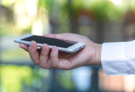 Female hand holding a moblie phone device on a wood table with green natural morning background.