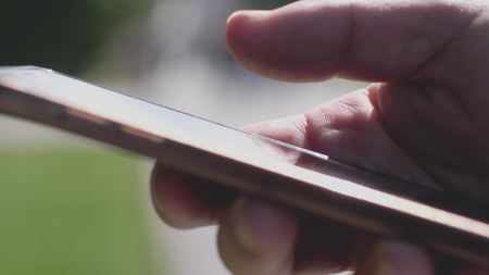 Man using smart phone outdoors against a nature setting, panning and moving in and out of focus