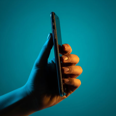 Modern smartphone in hand against a dark backdrop. Clean, minimalist aesthetic perfect for showcasing UI/UX designs, apps, or mobile technology concepts.