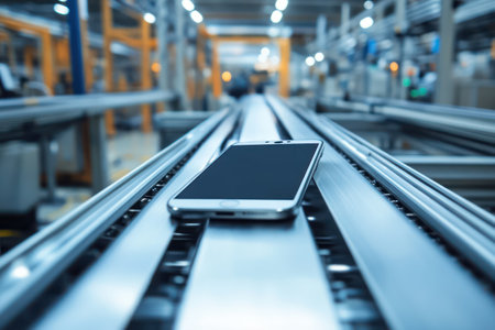Smartphone lying on a conveyor belt in a modern factory, representing automated manufacturing, technology production, and quality control.