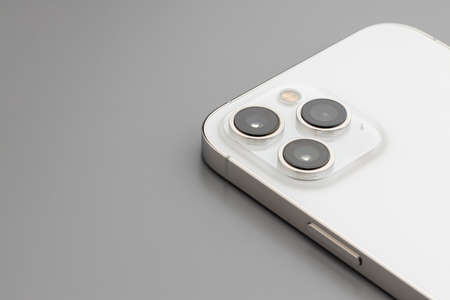 Bangkok, Thailand - 11.10.2020: Apple new smartphone iPhone 12 Pro Max from the back side. Action. Close up of three cameras, LED flash, and LiDAR depth scanner.