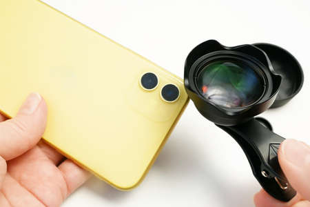 Hand holding smart phone equipped with extension lens on white background