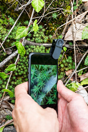ecologist botanist person using smartphone with macro lens attachment to capture detailed images of moss and plants in a natural forest setting. Close-up shot of mobile photography in nature