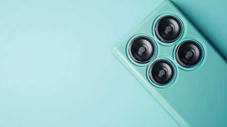 A mint green smartphone featuring four distinct camera lenses rests against a smooth, matching background, perfect for highlighting modern technology and stylish design.
