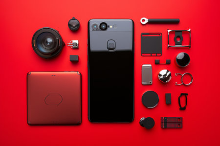 Minimalist mobile photography gear on flat surface tripod, phone, lens, light, tech blogger lifestyle background