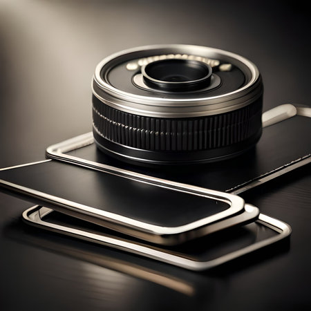 A visually appealing arrangement of various camera lenses and accessories on a dark surface, showcasing the intricate details and designs of each component.