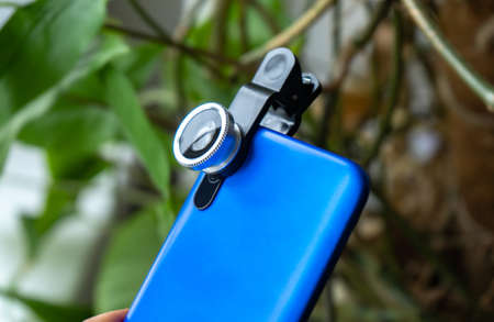 Overhead phone lens with clips on the blue modern smartphone. Extra macro camera for mobile device