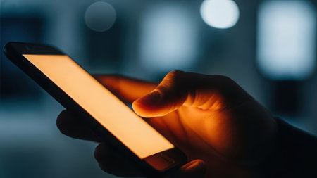 A close-up image of a hand holding a smartphone with a brightly lit screen, set against a blurred background.