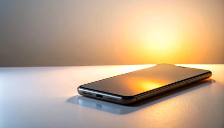 A modern smartphone rests on a clean, reflective surface, its screen capturing the warm, golden glow of a sunrise or sunset.