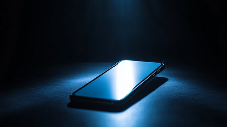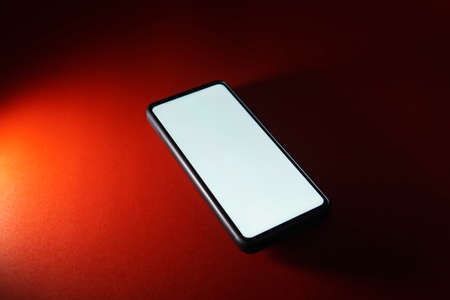 Smartphone with blank screen on dark background with beam of light. Selective focus.