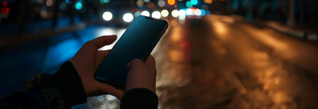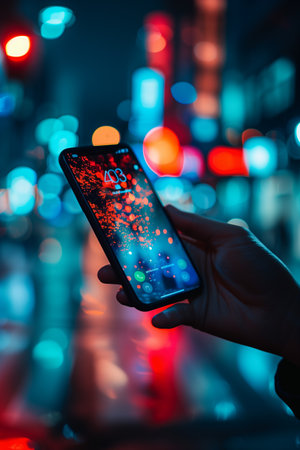 A striking image of a smartphone displaying a bustling city at night, with vibrant bokeh effects creating an exciting atmosphere, ideal for themes of technology and urban life.