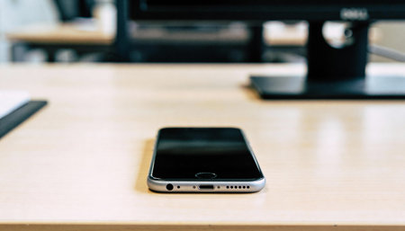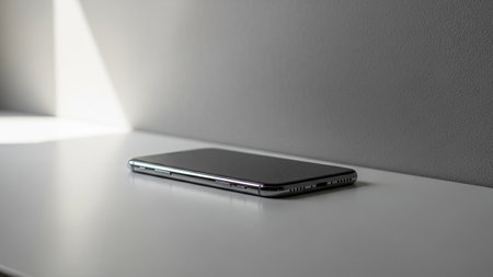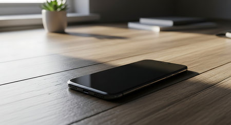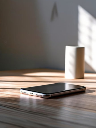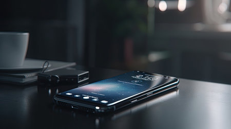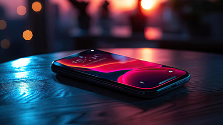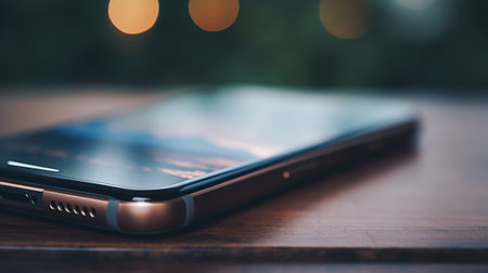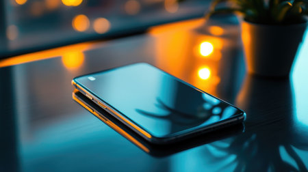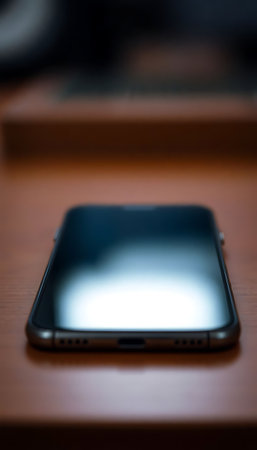 Smooth shiny surface of a new smartphone on a sleek modern desk, reflecting soft light