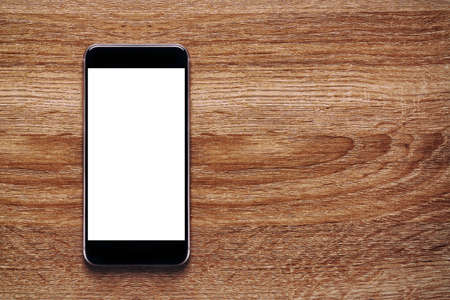 White smart phone with isolated screen on wooden desk