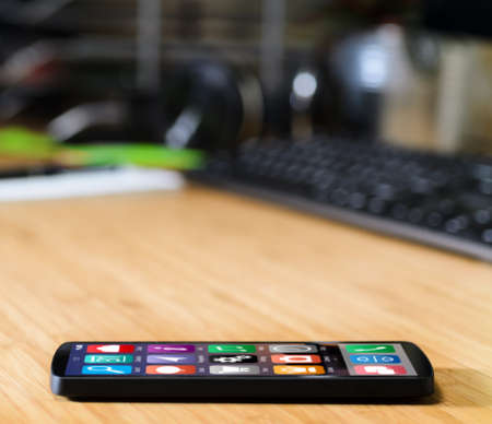 Mobile smart phone is located on the table. New technology in our life.
