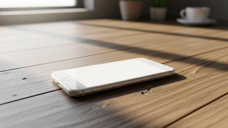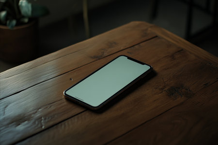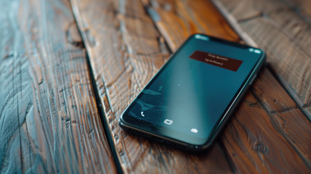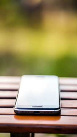 A smartphone sitting on a wooden table in front of a blurred background, AI