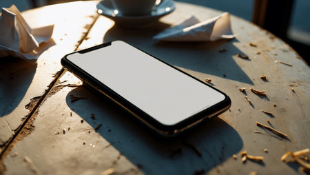 A smartphone resting on a rustic table beside a coffee cup and folded paper objects in soft sunlight