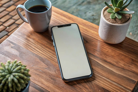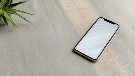 A smartphone on wooden surface with plant nearby, showcasing minimalist design