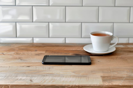 A smartphone sits on a wooden table with a blank screen, accompanied by a cup of tea on a saucer. The warm ambiance creates a relaxed atmosphere for browsing.