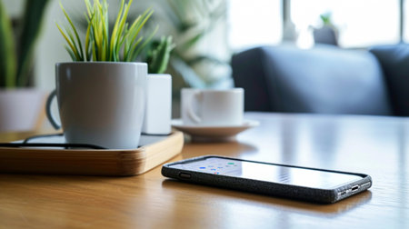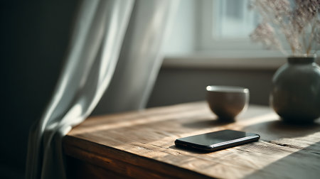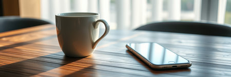 Morning routine with coffee and smartphone on a wooden table in natural light