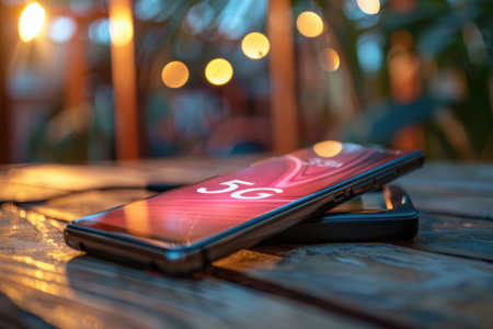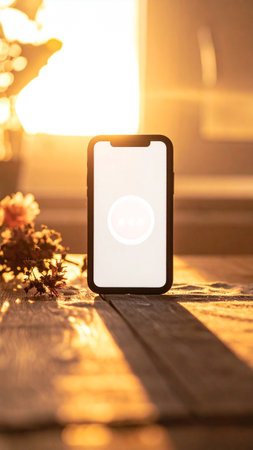 A close-up shot of a smartphone lying on a table with blurred bokeh lights creating a warm atmosphere.
