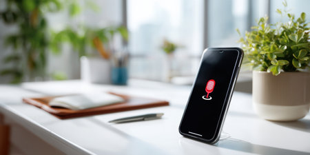 Smartphone with voice assistant icon on screen on white desk with plant and notebook in background
