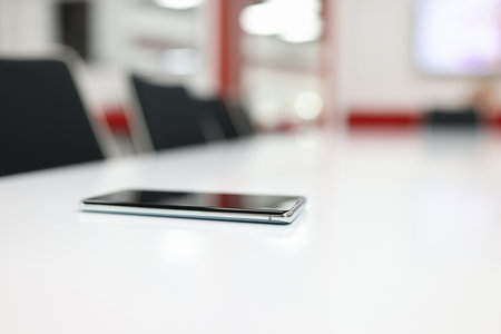 Smartphone on the table in the office. Selective focus.