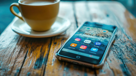 A stylish smartphone rests on a rustic wooden table, displaying various social media apps, accompanied by a warm cup of coffee, creating a perfect work and leisure atmosphere.