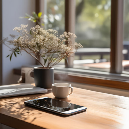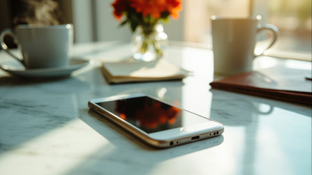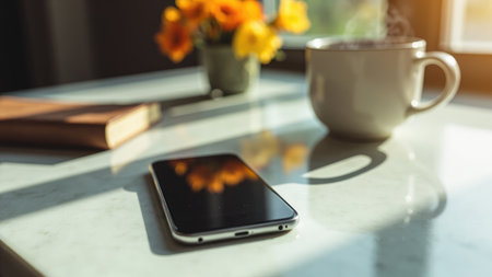A minimalist still life featuring a smartphone, coffee mug, and vibrant flowers on a marble table bathed in warm sunlight. Perfect for blogs, websites, or social media posts related to work from home, productivity, or a relaxing atmosphere. The image evokes feelings of calm and peace, ideal for showcasing lifestyle brands or technology.