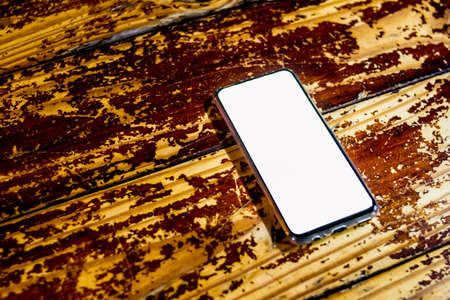 A mobile phone with a blank white screen for mockups lies on a rustic wooden surface in a dimly lit, atmospheric room, creating a moody and minimalist scene.