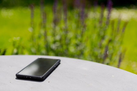 Switched off smartphone lying on grey painted garden table with blooming flowers in background, focus on smartphone