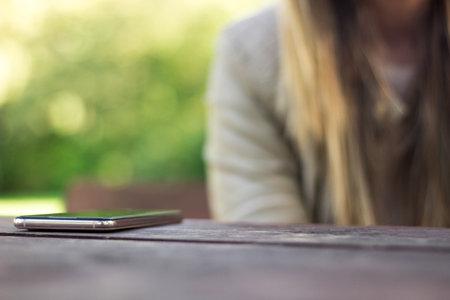 Woman leaving from street restaurant where she forget her mobile phone. Lost smart phone on table at outdoor cafe. Selective focus