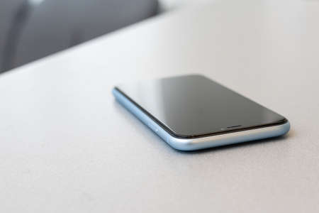 Mobile touchscreen phone lying on table in office. Working with gadgets concept